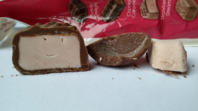 Nadzienia nie mogłam znaleźć, jest go maksymalnie mało (w sumie może to i dobrze?), a do tego ma niemal identyczną barwę. Wyodrębniłam małą grudkę, krem z zewnątrz był jak zaschnięty, w środku margarynowo - tłusty, z naciskiem na to pierwsze. Gęsty i zbity, z jakże cudowną spirytusową nutą, nie mocną, lecz wyraźną, na tyle, że czuć tylko alkohol z margaryną - nie jest dobrze.